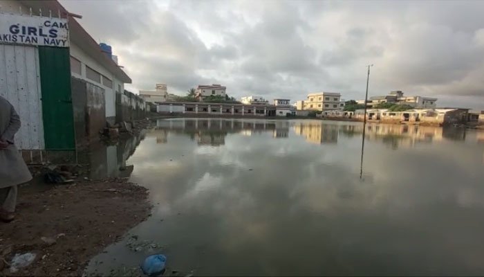 انہوں نے علاقے کے گورنمنٹ گرلز سیکنڈری اسکول پاکستان نیوی کا بھی دورہ کرایا جس کے اندر بڑے گراونڈ میں ایک فٹ سے زائد پانی جمع ہے، اس پانی سے اوپر نظر آنے والی اسکول کی عمارت تک کوئی ماہر تیراک ہی جا سکتا ہے۔