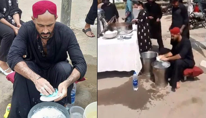 سوشل میڈیا پلیٹ فارم ٹوئٹر پر اس وقت ایک ویڈیو خوب وائرل ہو رہی ہے جس میں ایک شخص کالا لباس، لال ٹوپی پہنے نذر و نیاز کے لیے برتن دھو رہا ہے۔