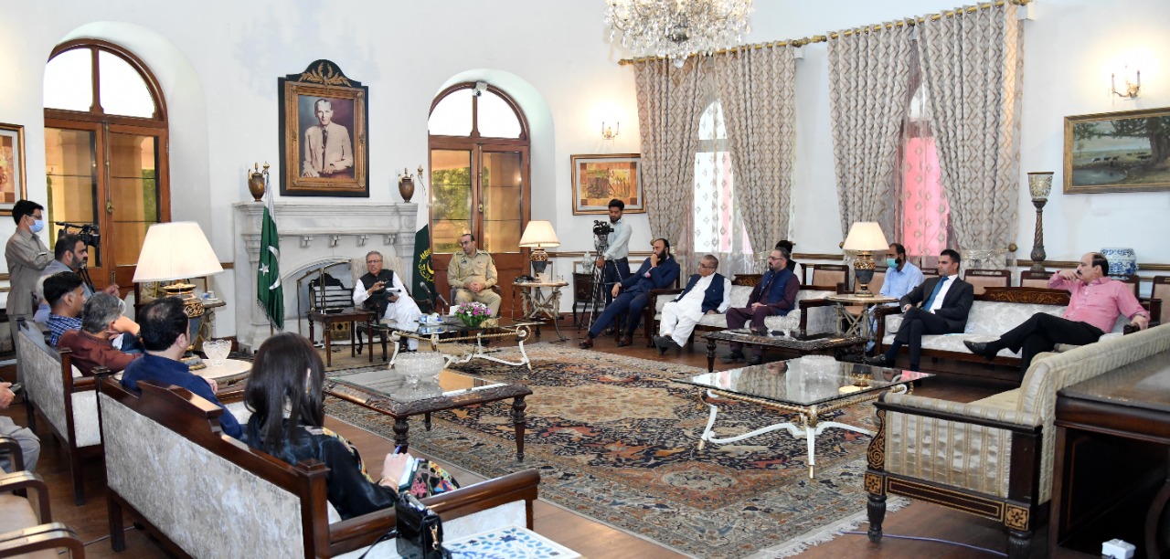 صدر مملکت ڈاکٹر عارف علوی سے گورنر ہاوس میں سینئر صحافیوں کی ملاقات، صدر نے کہا کہ بطور صدر ملک کے تمام ادارے میرے لئے قابل احترام اور عزیز ہیں،میں کسی قسم کا تنازعہ کھڑا کرنے پر یقین نہیں رکھتا۔