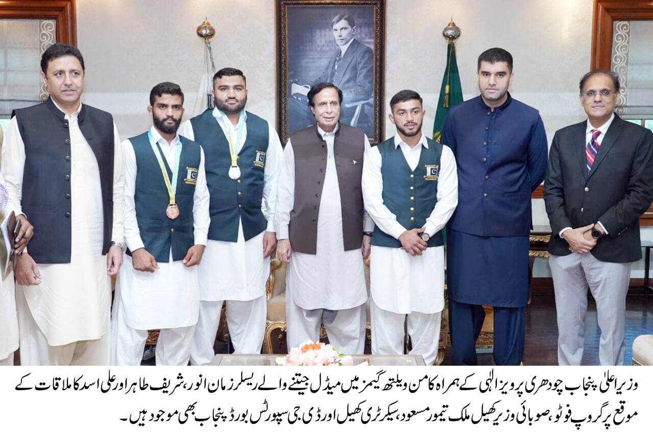 وزیراعلیٰ پنجاب چودھری پرویز الٰہی سے آج وزیراعلیٰ آفس میں کامن ویلتھ گیمز میں سلور میڈل جیتنے والے ریسلرزمان انور، شریف طاہر اور کانسی کا تمغہ جیتنے والے علی اسد نے ملاقات کی۔