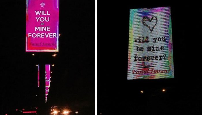 لاہور کے رہائشی حال ہی میں ایک سڑک پر لگے سٹیمرز پر ڈیجیٹل طرز پر پروپوزل دیکھ کر حیران رہ گئے۔سٹیمرز پر کسی نامعلوم لڑکی کی جانب سے فیصل عمران نامی شخص سے زندگی بھر ساتھ نبھانے کی رضامندی پوچھی گئی تھی جس پر تحریر تھا کہ کیا تم ہمیشہ میرے رہو گے ؟
