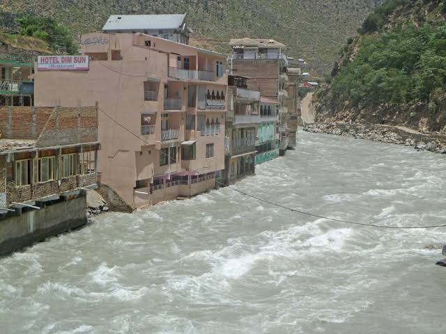 دریائے سوات میں طغیانی ، بحرین کے مقام پر سیلابی ریلہ کئی عمارتیں بہا لے گیا۔