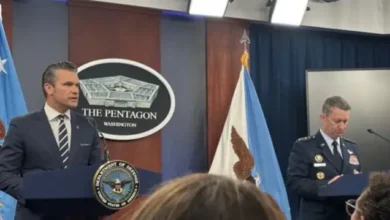 پینٹاگون میں امریکی وزیرِ دفاع پیٹ ہیگسیتھ اور چیئرمین جوائنٹ چیفس آف سٹاف جنرل ڈین کین کی بریفنگ میں ایرانی…