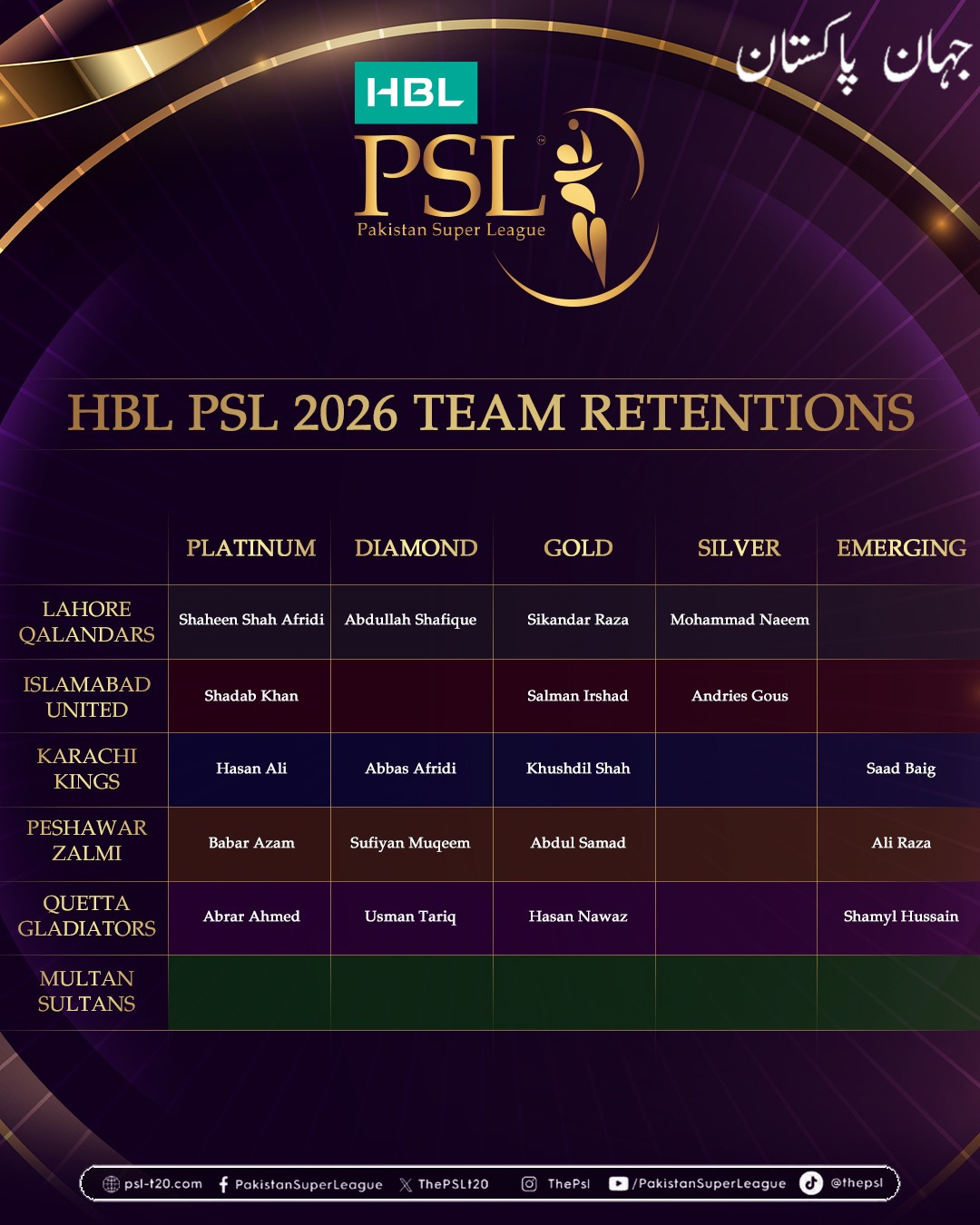 ملتان سلطانز نے پرانے سکواڈ سے کسی کھلاڑی کو ریٹین نہیں کیا
