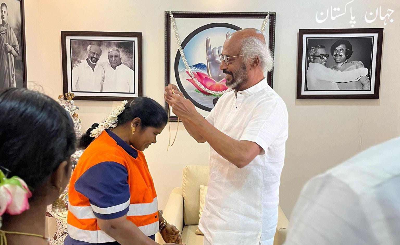 بھارت کے نامور اداکار رجنی کانت نے صفائی کرنے والی خاتون کو اس کی ایمانداری پر سونے کی چین کا تحفہ دے دیا۔
