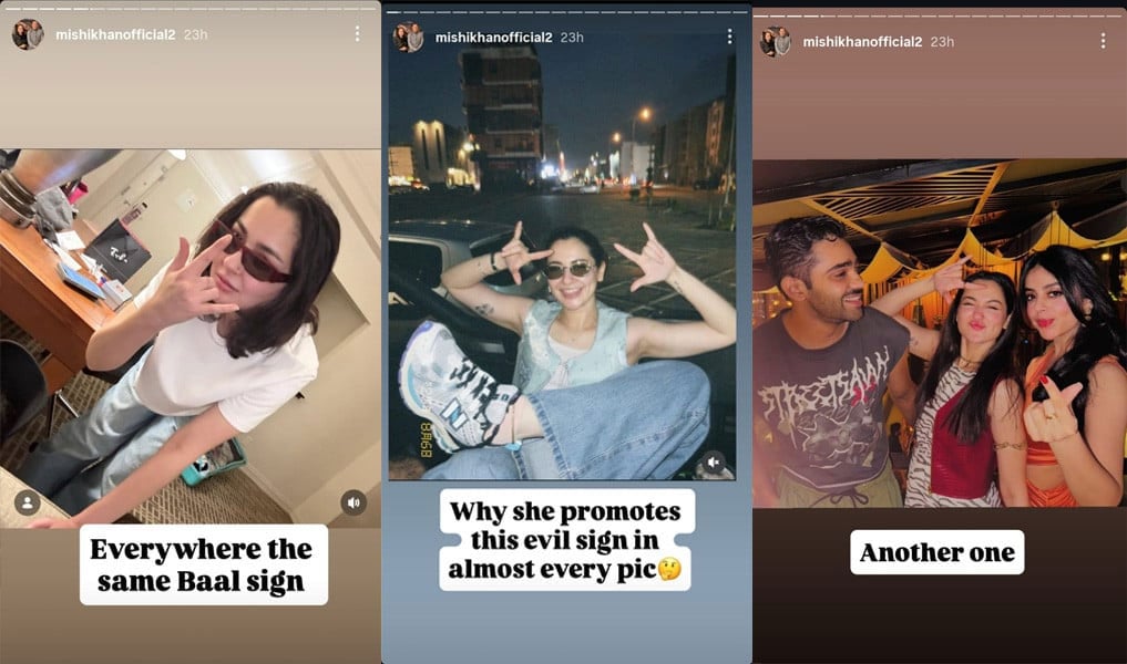 مشی خان نے انسٹاگرام پر ہانیہ عامر کی چند تصاویر شیئر کیں جن میں وہ ایک خاص انداز میں ہاتھ کا اشارہ کرتی دکھائی دے رہی ہیں۔