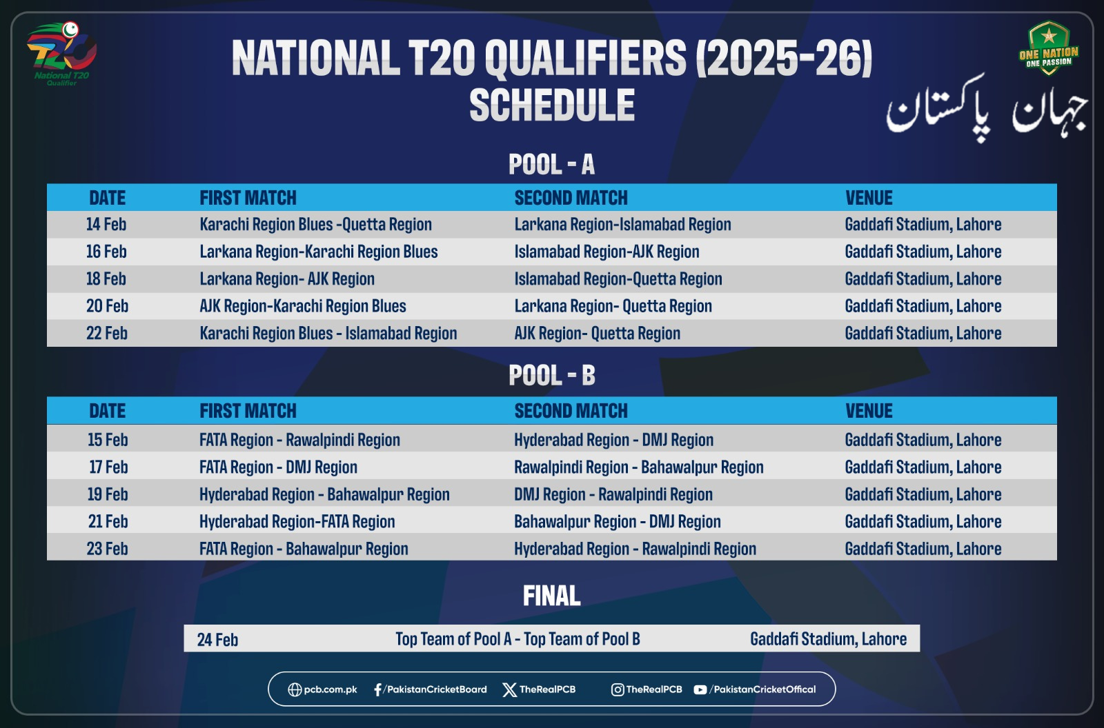 10 ریجنل ٹیموں پر مشتمل ٹورنامنٹ 14 سے 24 فروری تک قذافی سٹیڈیم میں کھیلا جائے گا