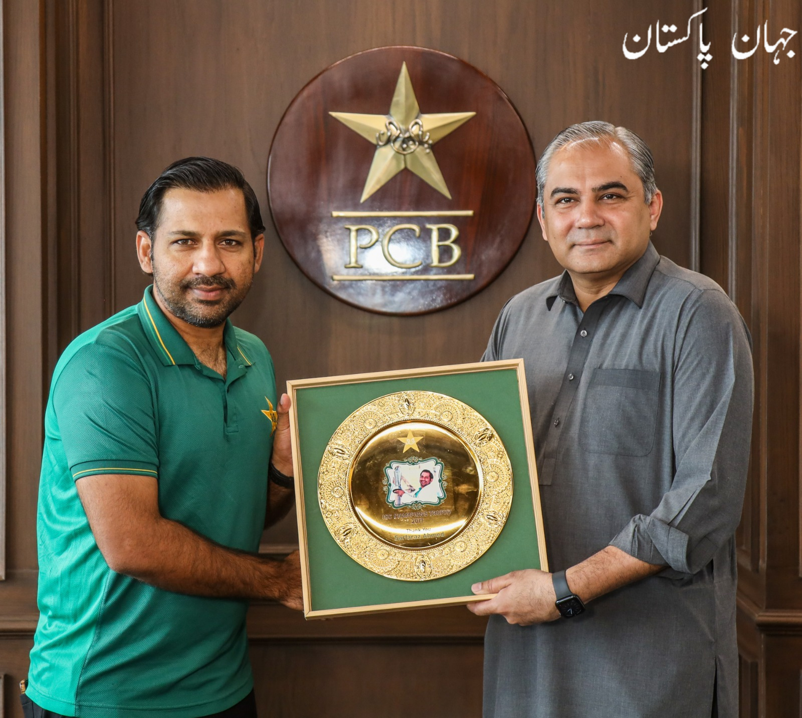 چئیرمین پی سی بی نے سرفراز احمد کو انٹرنیشنل کرکٹ سے ریٹائرمنٹ پر اعزازی شیلڈ دی