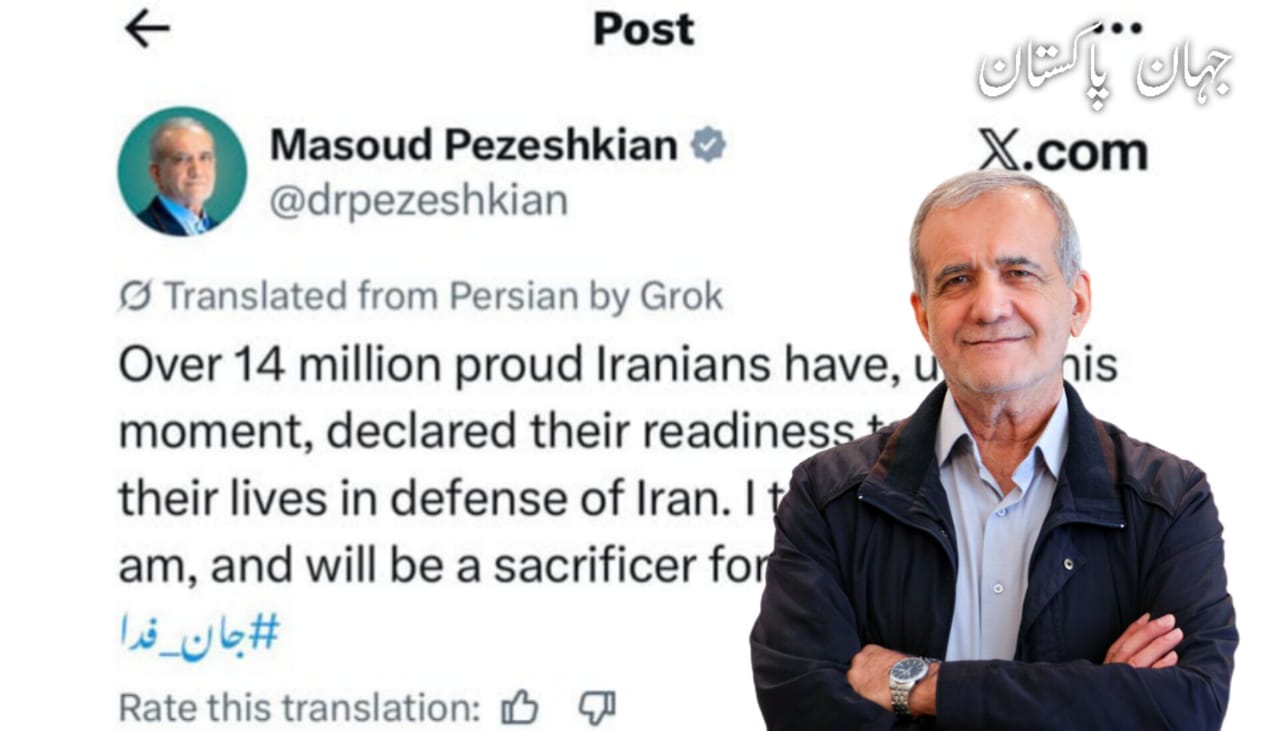 ایرانی صدر مسعود پزشکیان نے کہا ہے کہ اس وقت تک 1 کروڑ 40 لاکھ سے زائد قابلِ فخر ایرانیوں نے وطن کے دفاع میں اپنی جانیں قربان کرنے کے لیے تیار ہونے کا اعلان کیا ہے۔