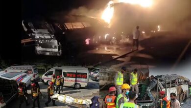 پنڈی بھٹیاں کے قریب مسافر کوچ اور پک اب وین میں تصادم کے بعد آگ بھڑک اٹھی اس ہولناک حادثے…